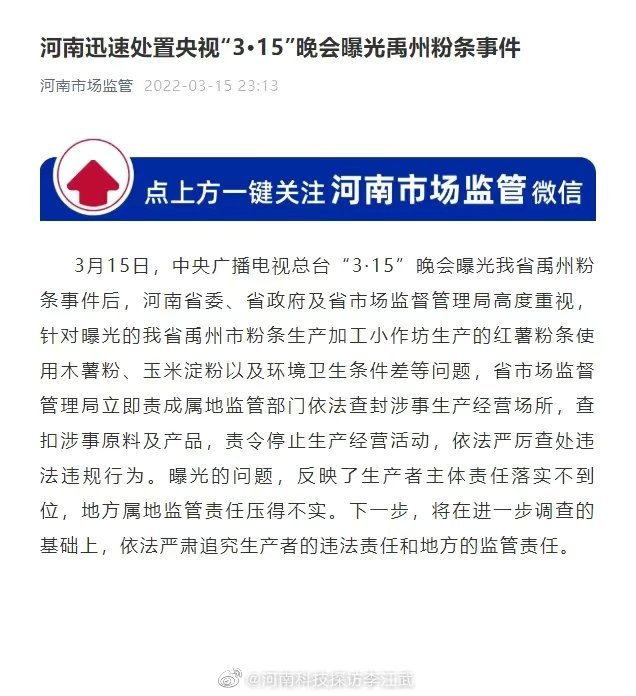 3月15日,中央广播电视总台“3·15”晚会曝光我省禹州粉条事件后,河南省委、省政府及省市场监督管理局高度重视,针对曝光的我省禹州市粉条生产加工小作坊生产的红薯粉条使用木薯粉、玉米淀粉以及环境卫生条件差等问题,河南省市场监督管理局立即责成属地监管部门依法查封涉事生产经营场所,查扣涉事原料及产品,责令停止生产经营活动,依法严厉查处违法违规行为。